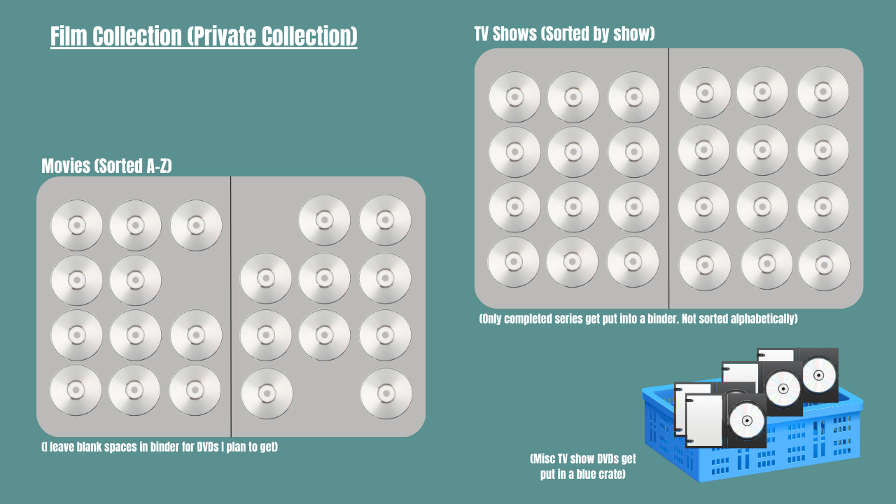 For my personal film collection, I demonstrated how I organize my DVDs at home. I store them in binders, separating movies from TV shows. My movie DVDs are alphabetized by title, but I leave empty spaces for future additions to multi-film series so I don’t have to reorganize the entire binder later. For TV show DVDs, I use both a binder and a blue crate. Completed series go into the binder since they won’t need rearranging, while incomplete series are placed in small, labeled cases and stored in the crate. The TV series in the binder aren’t alphabetized because I’m unsure which additional series or DVDs I’ll acquire, making it difficult to leave consistent space for each.