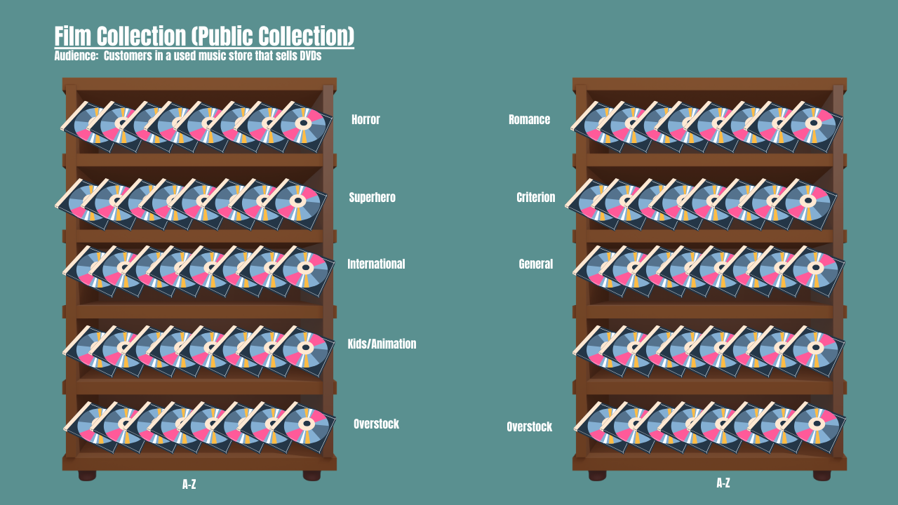 For my public collection example, for my target audience I chose adult customers at a used music and DVD store, modeled after the one I frequently visit in Seattle, WA. I imagine the DVDs arranged on tall bookshelves, separated by genres such as romance, horror, animation/kids, international, general, and Criterion. These clear divisions help customers looking for specific titles and improve overall findability. Some films may fit multiple categories, but if I have duplicates of DVDs, I could place them in different sections which could further assist customers in finding a DVD they want. Stores selling used goods have the benefit of not needing strict categorizations like big box stores and libraries as I feel like there is an expectation of the customer having to search through a lot to find something they want. There is no guarantee the store will have a certain title, so I feel like most people are just searching casually when looking at a used DVD collection in a store. Also, a lot of the time, the customer audience that go to these stores are typically collectors and enjoy the search.
