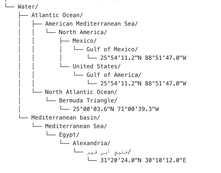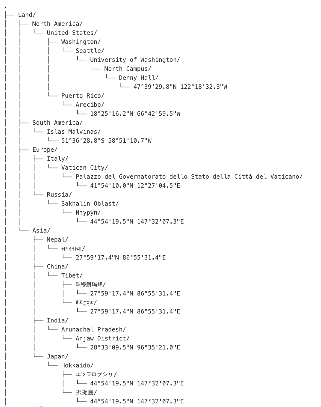 When I first started the hierarchy nesting activity, I began by using the official country that each coordinate was in or closest to, but this approach quickly felt insufficient as I continued working. I eventually shifted to two main categories: land and water. I felt by starting with these would allow me to better capture the common types of locations I would encountered. Under the land category, I usually moved from the continent level down to more specific locations. This worked well for places such as Denny Hall, but it was more difficult for sites like Mt. Everest. For places with contested ownership over the land (not the perfect term, but the most accurate one I have right now), I chose to list the coordinates in multiple locations. The most striking example of this was an island disputed between Russia and Japan: I placed it twice, once with the Russian name under Europe and once with the Japanese and Ainu names under Asia. In general, when there were contested rights over a place or region, I duplicated the entry with the name associated with each relevant country or region.