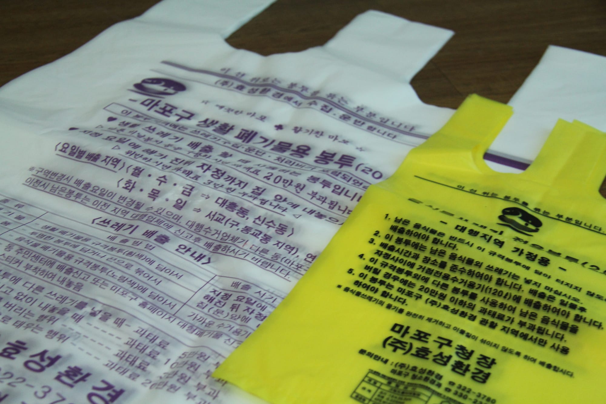 If you're from the United States, South Korea's trash system can be quite different. South Korea has three main categories for trash: general trash (일반 쓰레기 il-ban sseu-re-gi), recycling (재활용 쓰레기 jae-hwal-yong sseu-re-gi), and food waste (음식물 쓰레기 eum-shik-mool sseu-re-gi). For general trash and food waste, you need to buy special bags to put your trash into, which you can get at pretty much any convenience store. Although, it is best to buy these bags from the convenience store closest to you as these bags are specific to your district and city. And generally, the food waste bags are yellow and the general trash bags are white, but this may differ.