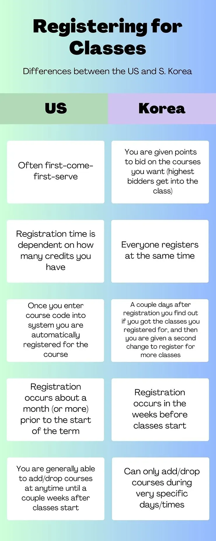 - Don't register for the intensive Korean courses during the first round of registration. Everyone gets into these, so don't waste your points)